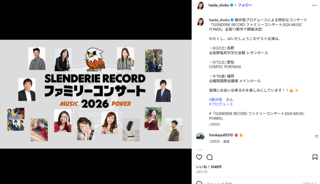 元うたのおねえさんで、タレントのはいだしょうこさんが3月15日にInstagramを更新。「ファンクラブ『しょこらんたん(ニコニコマーク)325号室』のファンイベント」を終え、近況について報告しました。