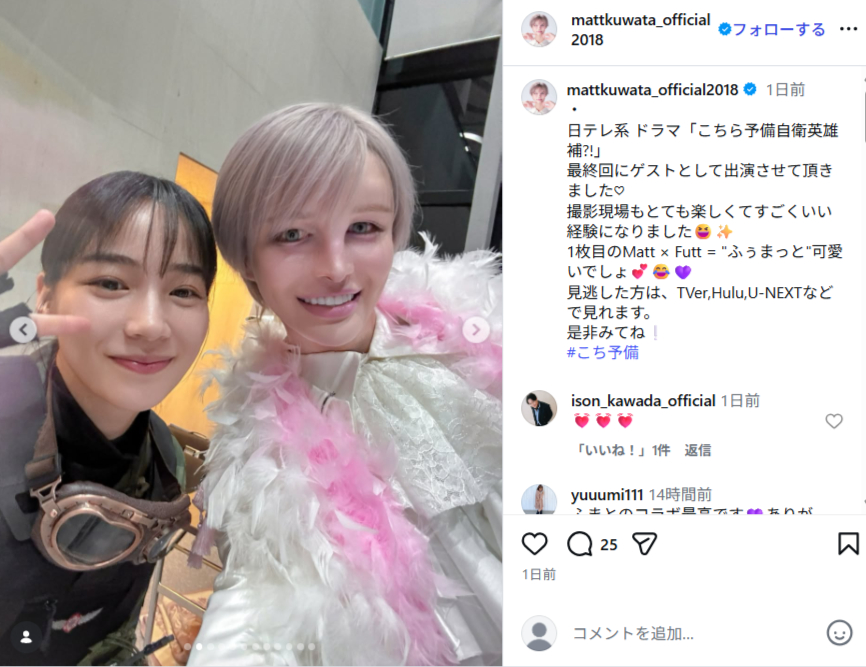 3月11日に日本テレビ系で放送された連続ドラマ「こちら予備自衛官英雄補?!」の最終回にゲスト出演したMattさん。投稿では「撮影現場もとても楽しくてすごくいい経験になりました」と撮影を振り返りました。