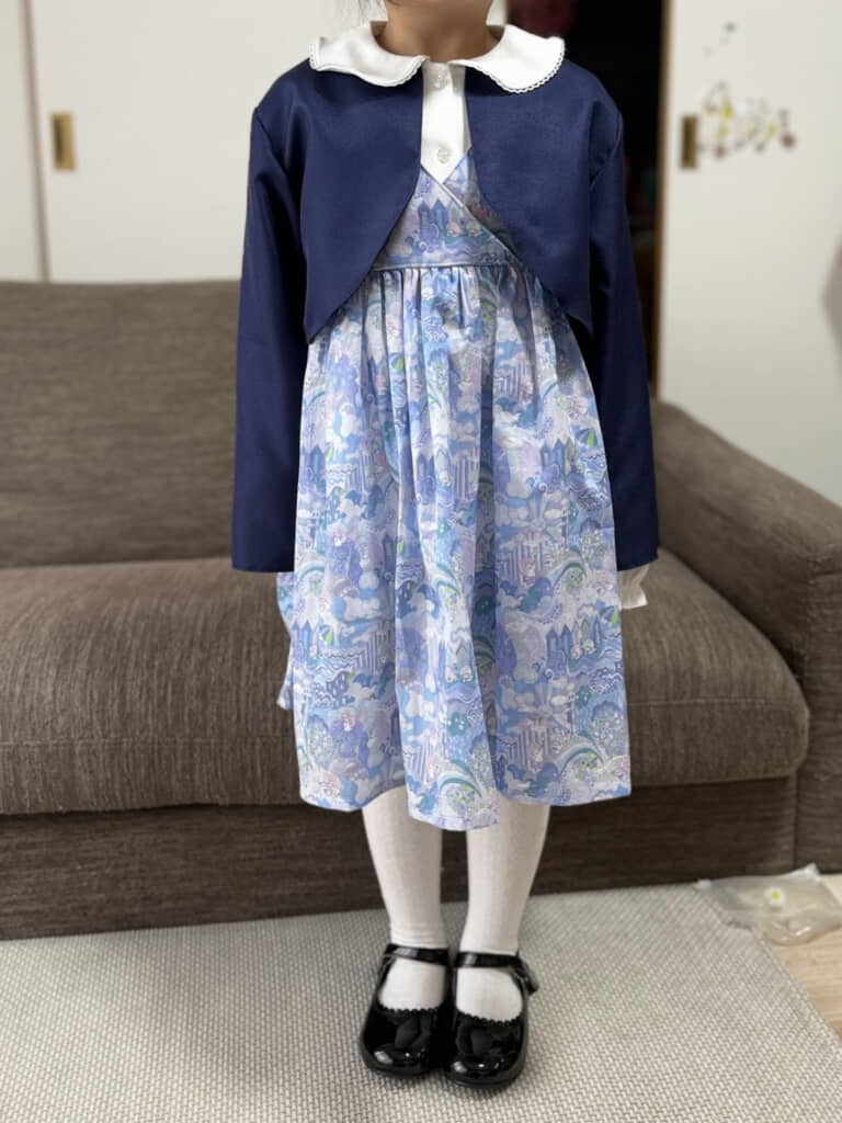 目を引くのはワンピースの絵柄。なんとサンリオの「リトルツインスターズ キキ&ララ」とコラボレーションした、リバティ百貨店のプリント生地なのです。緻密な模様の中に、キキとララの姿が見られ、上品な雰囲気でありながら、ファンシーでキュートなワンピースに仕上がりました。世界に一つだけのママ特製の洋服で迎える卒園式は素晴らしい思い出の日となりますね。
