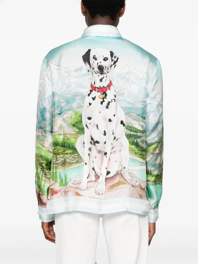 出演時、大森さんが着用していたとみられるのは、フランスのファッションブランド「Casablanca(カサブランカ)」による「Classic Long Sleeve Patterned Silk Shirt」のブルー。フロントとバックともに山岳風景が描かれており、バックにはダルメシアンとみられる犬がプリントされています。オンラインショップ上での参考価格は10万円以上です。大森さんはこのシャツの上にグレーのジャケットを羽織っており、ふちなしメガネを装着していました。