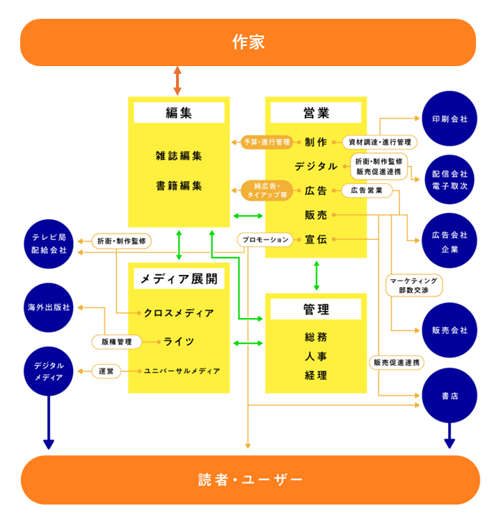 図を見ると、「編集」部門を起点にして、その周囲に「営業」「宣伝」「デジタル」「版権」「事業」といった各部門が配置されています。これは、富を生む源泉である「作家」との窓口となる編集部が、事業展開において極めて大きな力を持っていることも示しています。