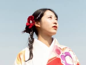 撮影の舞台は陸上競技場。女性が学生時代に部活に打ち込んだその場所を選びました。写真には、はかま姿のままクラウチングスタートの構えを取るカットもあり、見慣れたスタートラインと晴れの日の装いの組み合わせが、強い印象を残します。