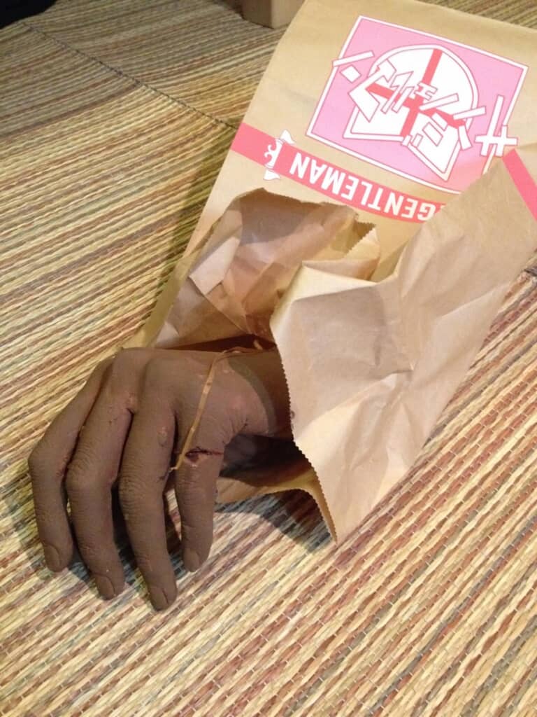 「サンジェルマン」と書かれた紙袋。これだけ見るとありきたりなパン屋の紙袋かと思ってしまいますが、問題はその中身。入っていたのは、リアルな人間の手のような形のチョコレートでした。形が形なだけに、茶色のカラーも変色した本物の手のように感じられます。