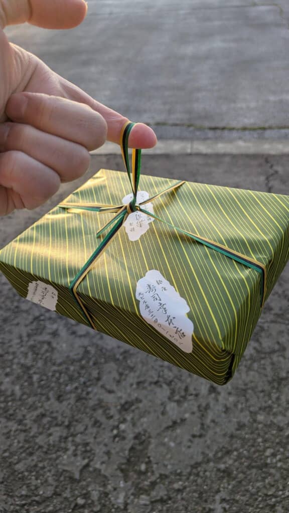 銀座のお店で詰めてもらったというおすし。高級そうな箱に入ってヒモが付けられている形状は、なんだか『サザエさん』などでお土産として持って帰っているおすしの形状にそっくり! 実際に存在していることにもびっくりします。