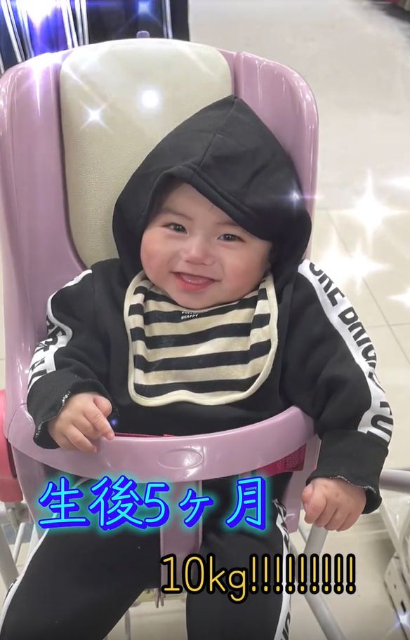 さらに生後5カ月を迎えた現在の息子さんは、早くも体重10キログラムの大台に突入! 手足も立派に成長し、顔立ちがはっきりしてきました。これからの成長も楽しみですね。
