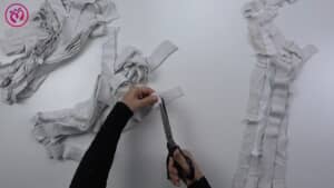 次に登場するのは、使い古した白いシャツやタンクトップです。これらをはさみで大胆にカットし、細長い棒状にしていきます。