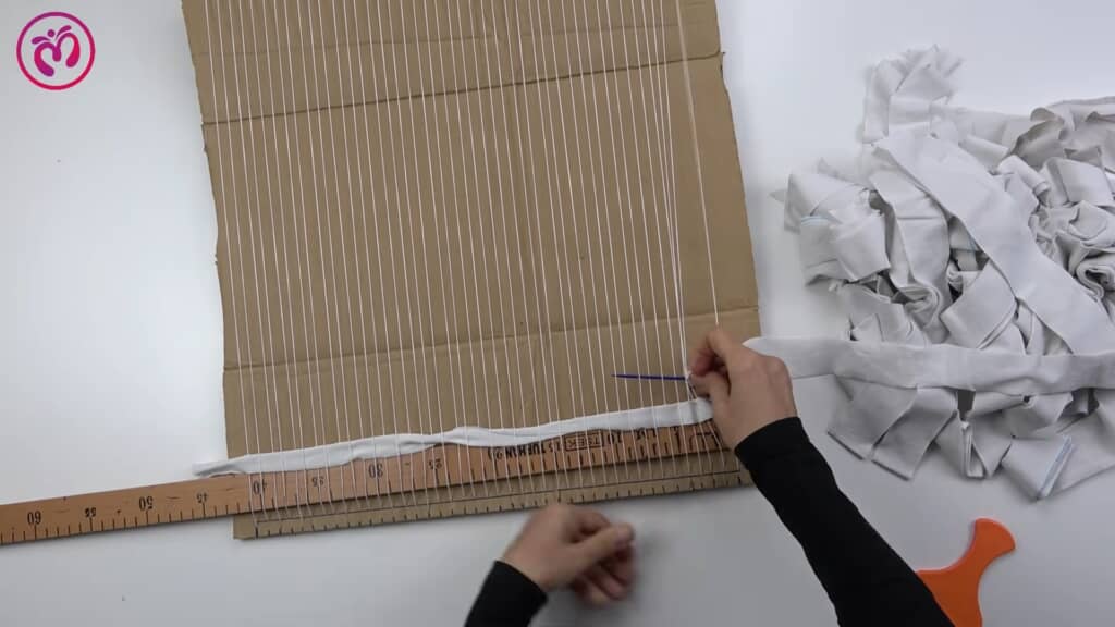 動画はまず、長方形にカットされた段ボールの端に1センチ間隔で印をつけ、切れ込みを入れるところからスタート。そこに白い糸を何本もピンと張っていく様子が映し出されます。簡易の織り機のような構造で、これがすべてのベースとなります。