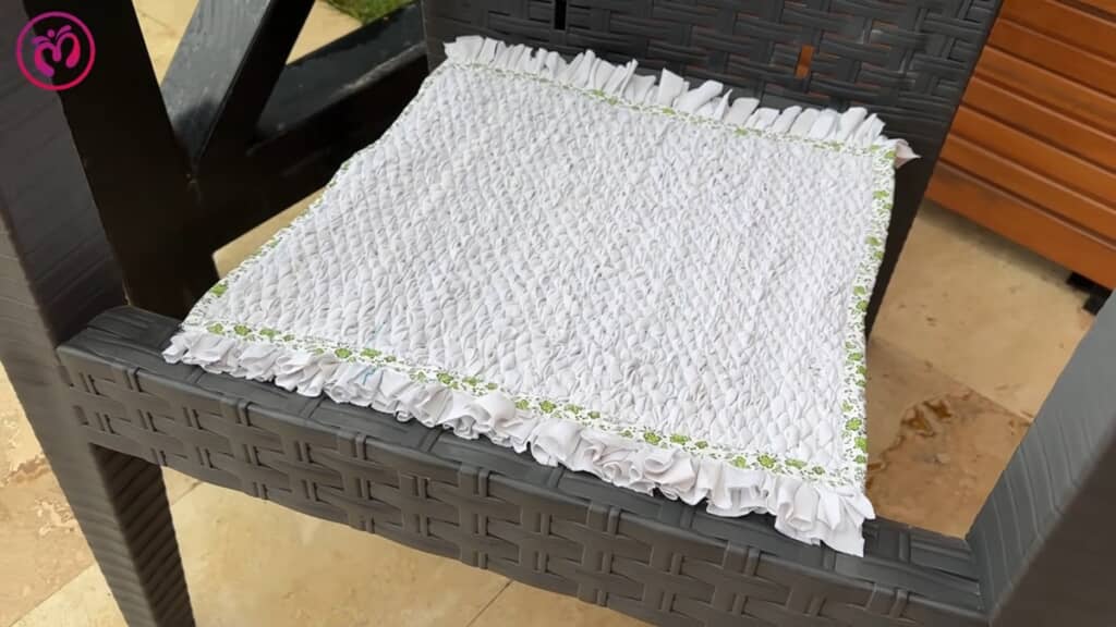 余分な糸もカットして形を整え、最後にリボン状の生地で縁を補強したら……おしゃれなマットの完成です!