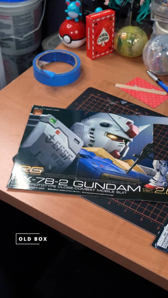 今回話題となっているのは、ガンプラの箱をカットして透明ケースに収めるというシンプルなDIY。動画は、ガンプラの空き箱の一部を机の上に広げた状態から始まります。登場するのは、「RX-78-2 GUNDAM Ver.2.0」と表記されたパッケージ。鮮やかな色彩と迫力ある機体が印象的で、捨てるのがもったいないデザインですね。投稿者さんは機体のアップやロゴなど、ポイントとなる部分を選んで切り出していきます。