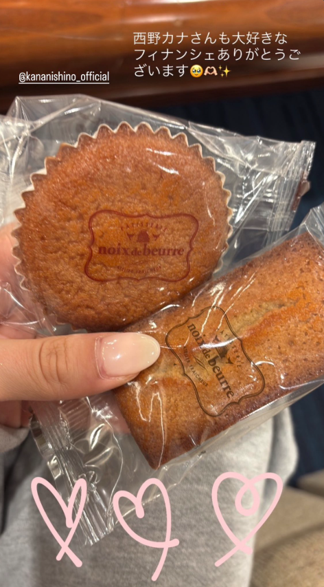 ニナさんはストーリーズで、「大好きなフィナンシェありがとうございます」と西野さんにメンションを付けてコメントし、焼き菓子の写真を投稿。差し入れは人気洋菓子店「noix de beurre(ノワ・ドゥ・ブール)」のマドレーヌやフィナンシェとみられます。
