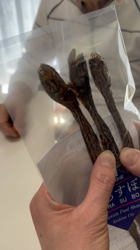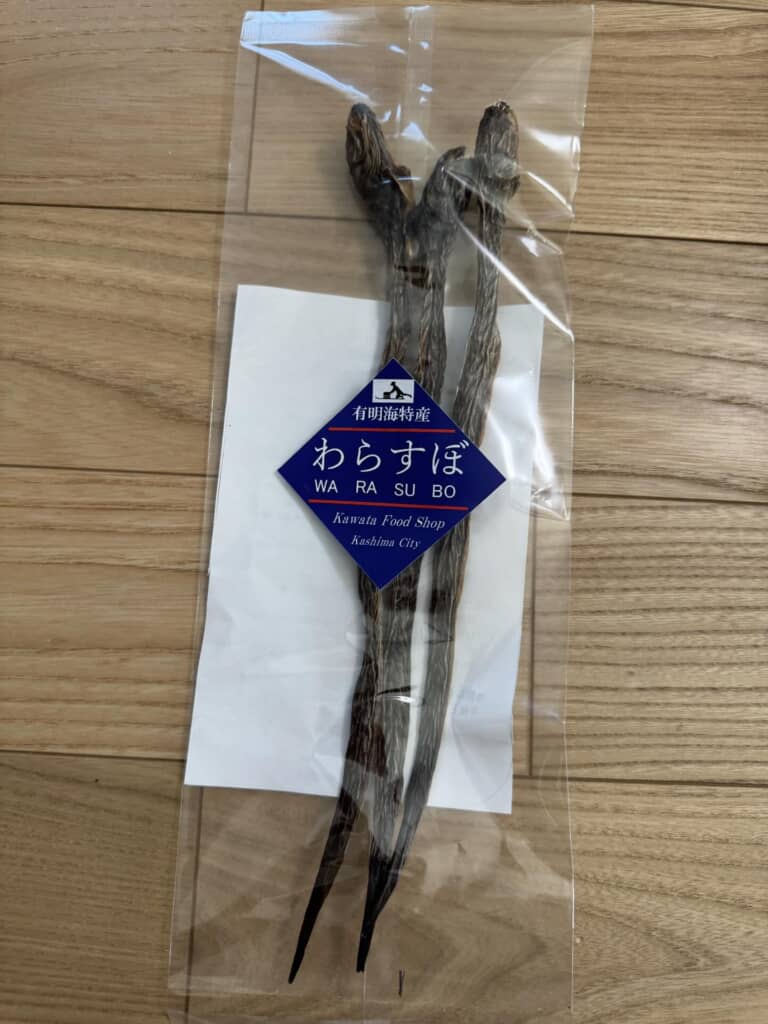 見た目は、ひょろひょろと長い「つくし」のようにも見えますが、ハゼの仲間である「ワラスボ」という魚を干したものだそうです。これを、上から見てみると……?