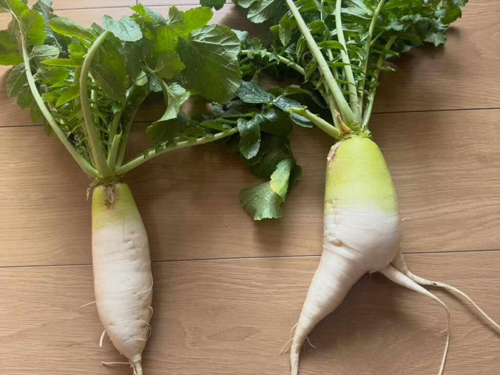 一方は見栄え良くまっすぐに育っているのですが、同時に収穫したもう一方の大根を見ると、ちょっぴりクセが強い形に……!