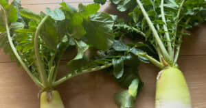 今回話題になっているのは、ベランダで育てた大根を収穫したという投稿です。土から引き抜かれた2本の大根は、青々とした葉に薄緑から白へきれいなグラデーションがかかった立派な姿をしています。