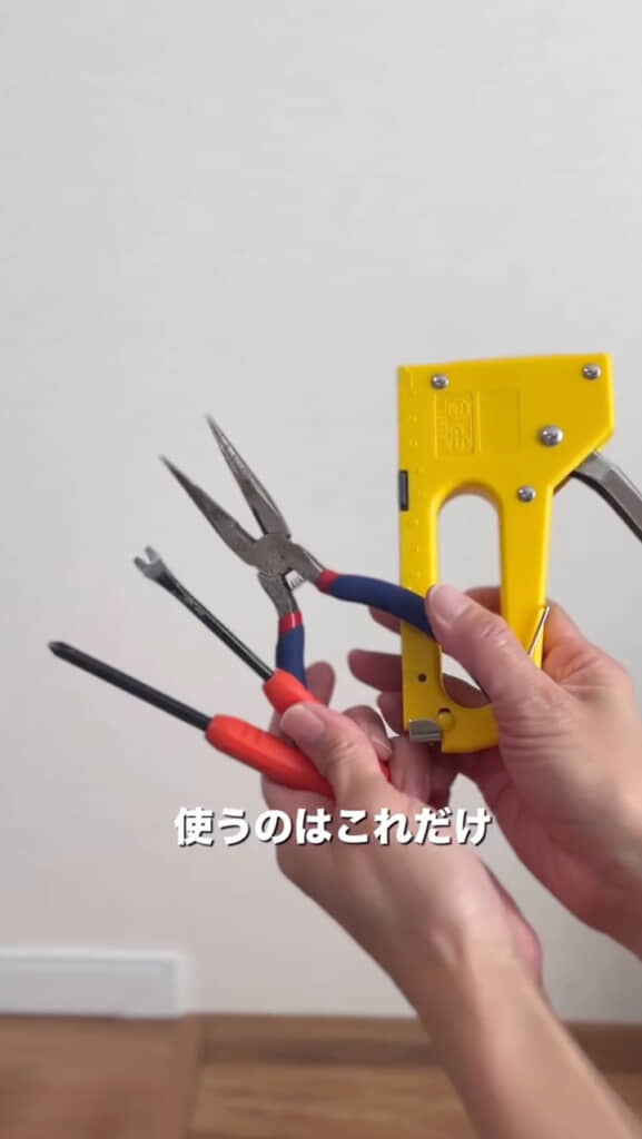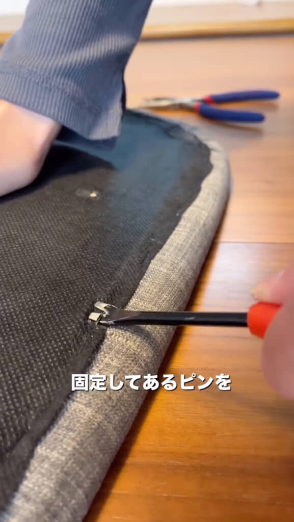 使用する道具は、プラスドライバー、釘抜き、ペンチ、タッカーのみ。まずはドライバーでネジを緩め、座面を本体から取り外します。そして、裏側に固定されているピンを釘抜きやペンチで外し、裏地と表地をはがしていきました。