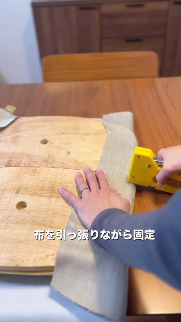 続いて、カーテン生地の上に座面を置き、一回り大きめにカット。布をしっかり引っ張りながら裏側へ折り込み、タッカーで少しずつ固定していきます。全体を留め終えたら、余分な布をカットして整えましょう。