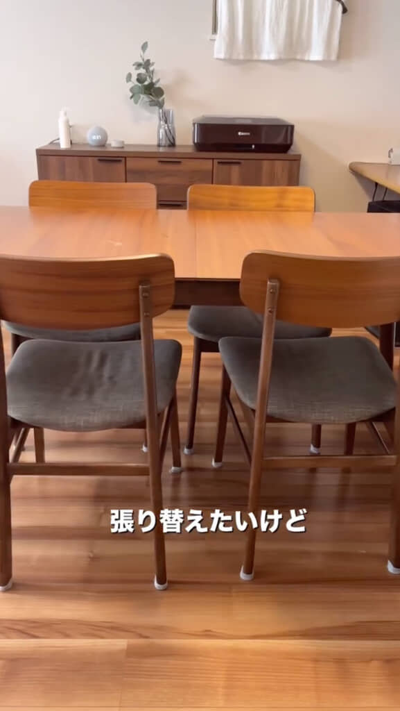 小さな子どもがいる家庭では、飲み物や食べ物をこぼしてしまうことも多く、ダイニングチェアはどうしても汚れがち。きなさんも以前から食卓椅子の汚れが気になっており、張り替えをしたいと思っていたそうですが、以外とお値段が張ったり、好みの色がなかなか見つからなかったりと、機会をうかがっていました。