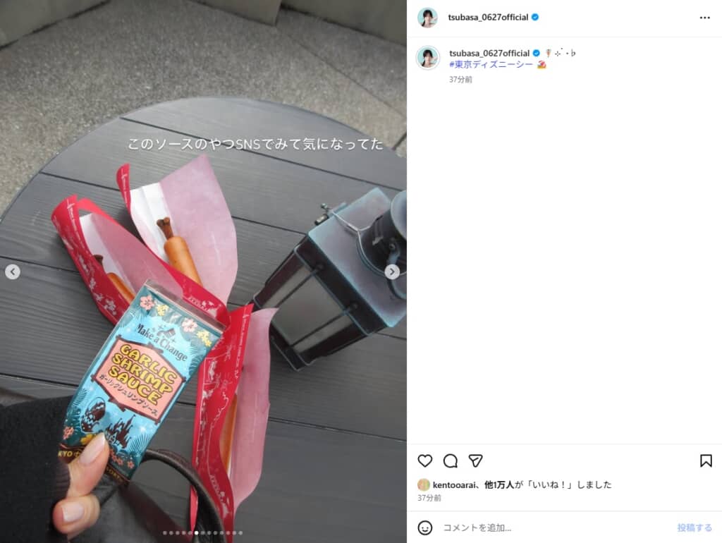 さらに、「アメリカンウォーターフロント」内にある「バーナクル・ビルズ」で販売されている骨付きソーセージや、SNSで見かけ気になっていたという「ガーリックシュリンプソース」を堪能する様子、「ギョウザドッグ」にかぶりつく姿を公開しています。