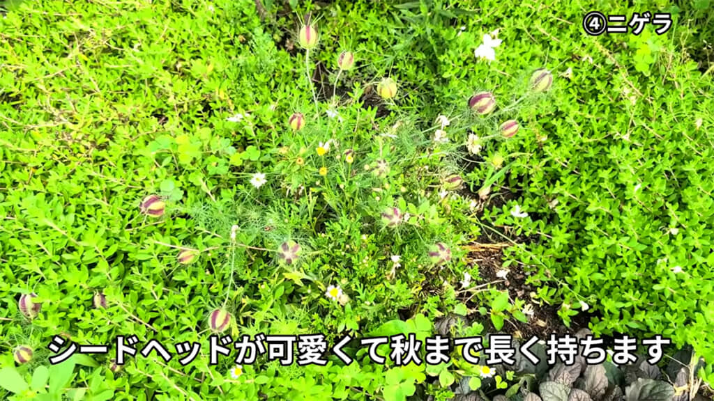 続いて紹介するのは、可憐だけれどあまり目立たない「ニゲラ(別名:クロタネソウ)」。ニゲラの花の時期は長くないけれど、代わりに秋までシードヘッドが長持ちします。3年前に植えてからこぼれ種で咲き続けているというニゲラの種子は嫌光性なので、草むらの中などの暗い場所で発芽しやすいようです。こぼれ種もただばらまくのではなく、きちんと土に植えてあげたいですね。