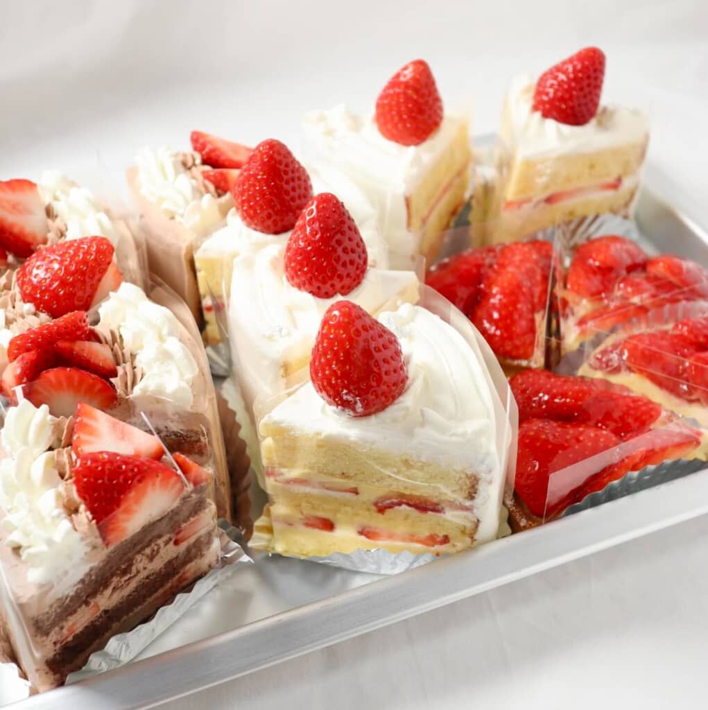 )さらにカットしたケーキをずらりと並べたいちごづくしの光景。まるでお店のような完成度で、見ているだけで幸せな気分に
