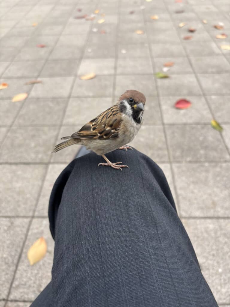 「異常に遠慮がありません」と添えられた写真には、堂々とひざに乗ってカメラに目線を向けているスズメの姿がばっちりと写っており、逃げ出す気配は微塵も感じられません。遠慮がないってレベルじゃないぞ……。