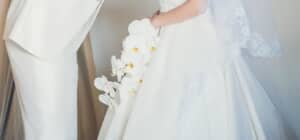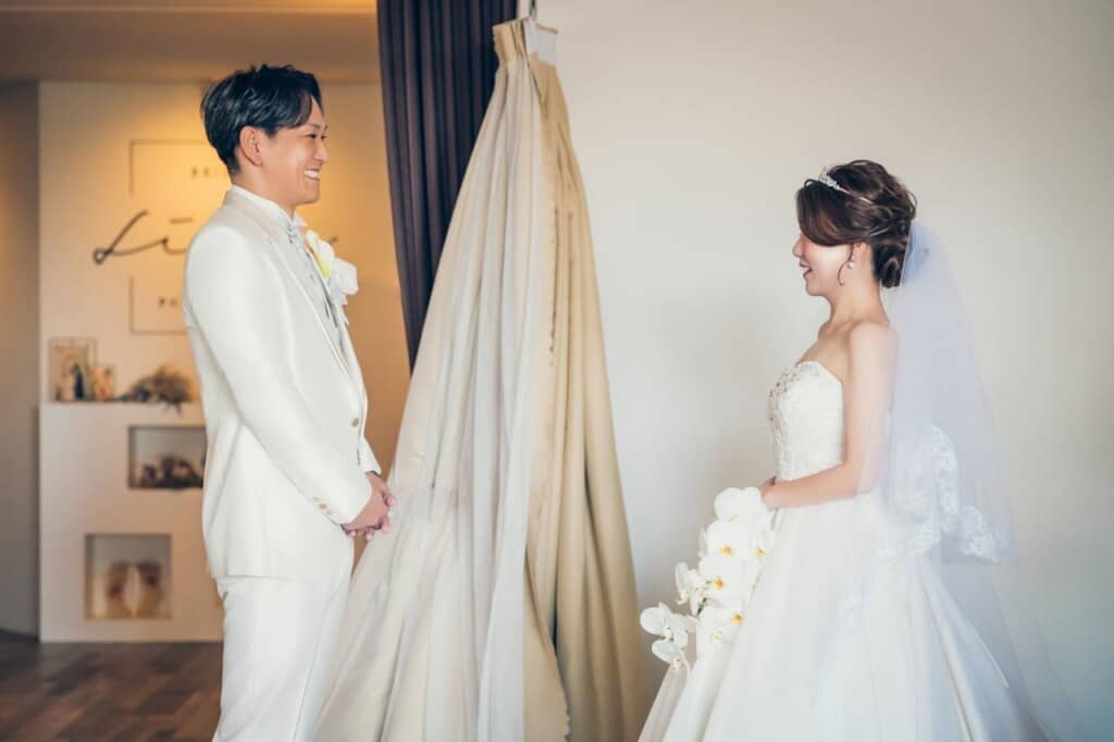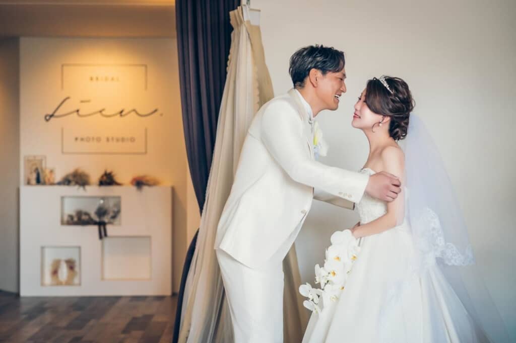 最初のカットでは、向かい合って立つ2人の姿が映し出されます。父は純白のタキシードに身を包み、柔らかな笑顔で母を見つめています。一方の母も、純白のウェディングドレスに身を包み、ティアラとベールを合わせた上品な装い。手には白いブーケを持ち、どこか照れくさそうに、しかしうれしそうにほほ笑んでいるのが印象的です。スタジオの落ち着いた照明とシンプルな背景が、2人の姿をより美しく引き立てていますね。