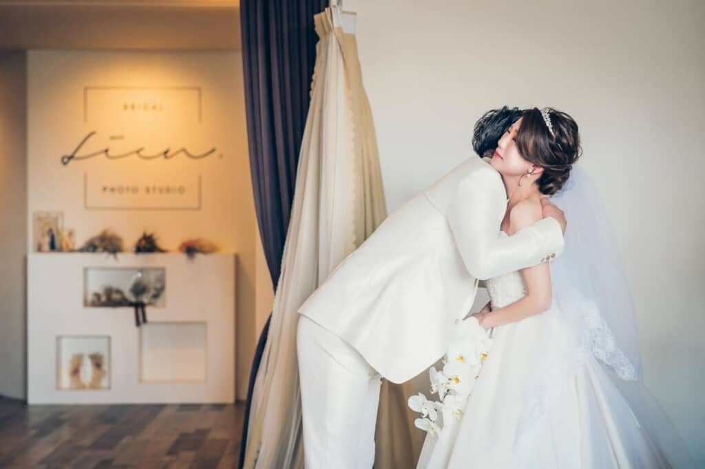 さらに、優しく抱きしめるカットへ。母は少し目を閉じ、安心したような感動したような表情を浮かべ、父はそんな母を包み込むように抱きしめます。その姿からは、これまで2人が積み重ねてきた時間と信頼関係が自然と伝わってきます。言葉にしなくても伝わる想いが、写真いっぱいにあふれているようです。父40歳、母43歳というタイミングで撮影されたその姿は、年齢を感じさせない輝きに満ちています。