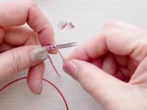 口を閉じたら、次が重要なステップ。三角形の底辺の真ん中をとじ針で並縫いのように縫います。そこから頂点に向かって針を刺してぎゅっと引き締めて結ぶと……、ころんとした小さなハートが完成します。