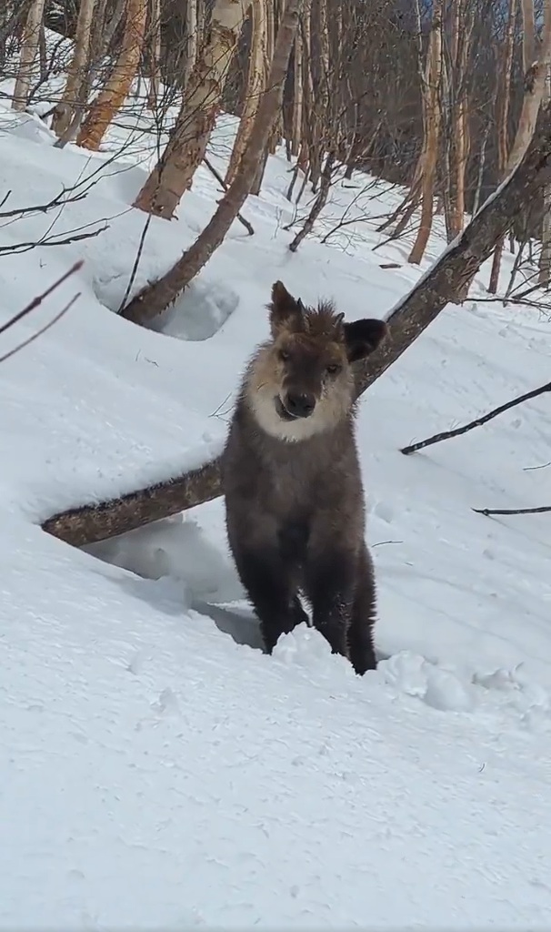 今回話題になっているのは、雪が降り積もった斜面で遭遇した生き物を紹介する動画です。スキー場のゴンドラリフトがのんびりと通り過ぎていく様子を眺めていると思いきや、少年さんが振り返ると……。