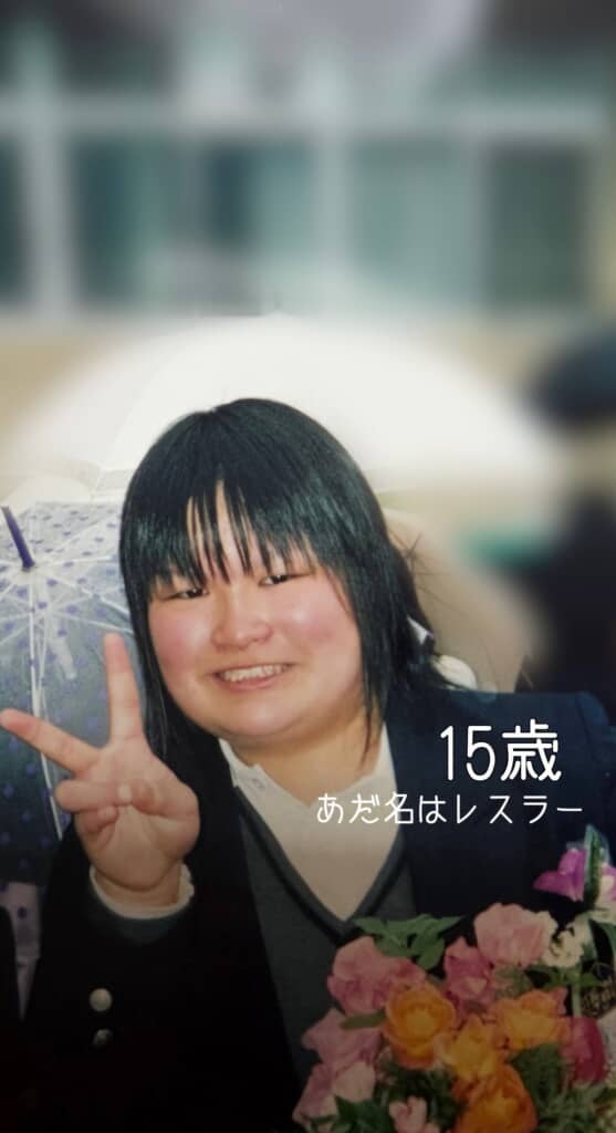 制服姿で花束を抱え、ピースサインをするmegumiさん。少し照れたような笑顔が印象的で、どこにでもいる等身大の学生の姿です。しかしこのころ、megumiさんは「レスラー」と呼ばれていたと明かしました。