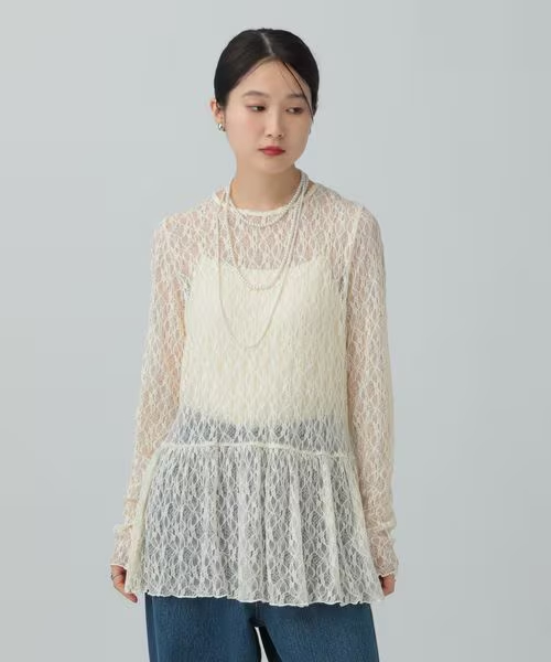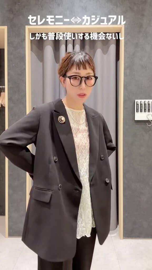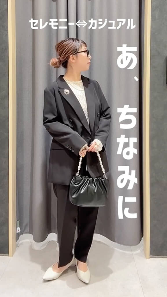 ブラウスの代わりに着用するのは、透け感のある「総レース長袖ペプラム」。こちらに黒のダブルジャケットとテーパードパンツを合わせることで、きちんと感のあるセレモニースタイルに。繊細なレースがほどよく華やかさをプラスし、式典にもぴったりな装いに仕上がっています。