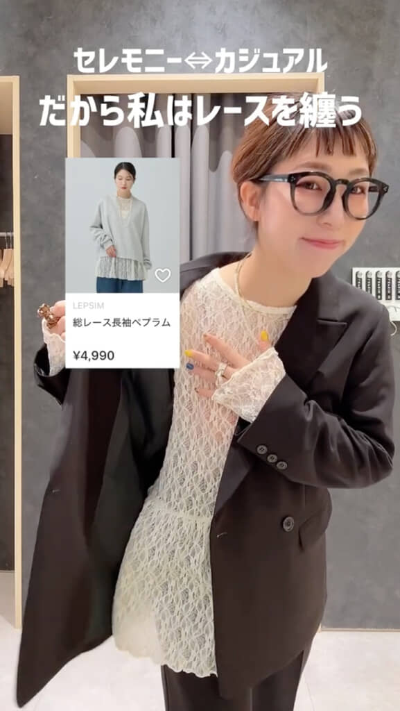 なお、動画で着用しているアイテムは全てレプシィムのアイテムとのこと。現在公式オンラインサイトでは、今回の動画で着用した「総レース長袖ペプラム」が4990円で販売しています(記事執筆時点)。各アイテムの詳細は、andSTで確認できるので、気になる人はチェックしてみてはいかがでしょう。