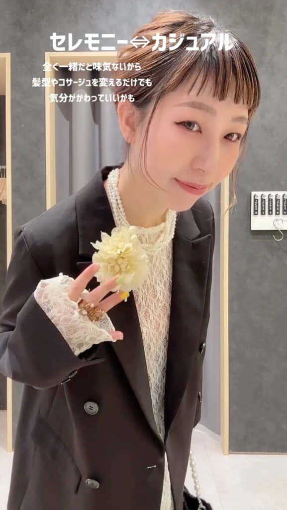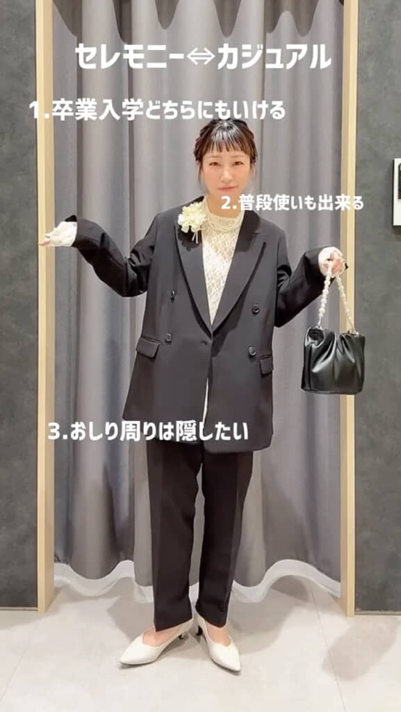 こちらのコーデは卒業式と入学式のどちらにも対応できるスタイルとのこと。ただ、全く同じ着こなしでは味気ないので、髪形や小物を変えて変化を出すのがおすすめです。動画のように白をポイントで入れるのもおしゃれですが、卒業式では少し落ち着いたトーンでまとめてみてもいいかもしれません。