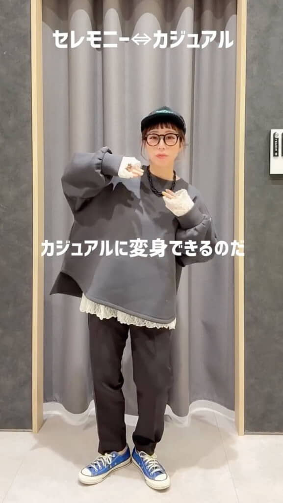 また、式典が終わった後は、ジャケットを脱いでスウェットを上から着ればカジュアルスタイルに。そのまま買い物や食事に出かけられるのもうれしいポイントです。これなら着回しやすく、さまざまなシーンで活躍してくれそうですね。