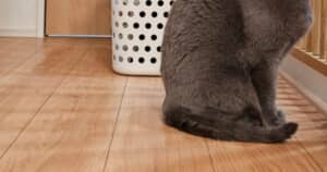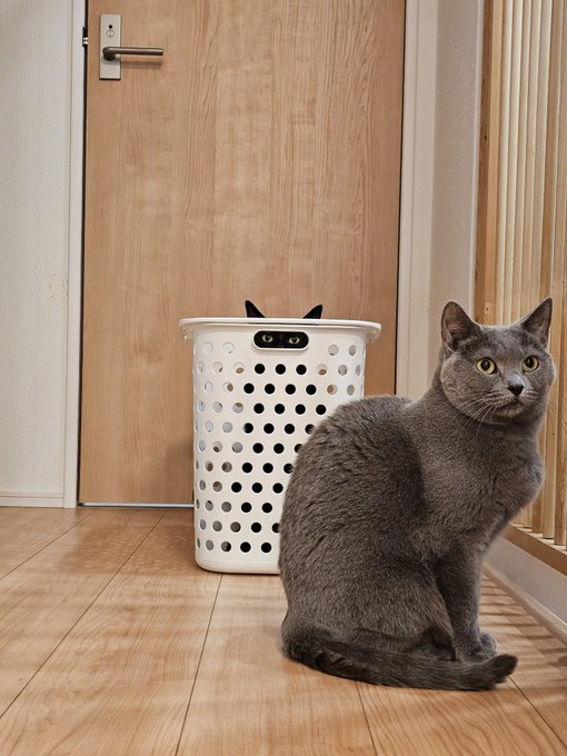 今回話題になっているのは、自宅の廊下でどこからか視線を感じたという写真です。廊下には1匹の猫がおとなしく座っている、何気ない日常の光景に見えますが……。よく見ると、奥の扉前に置かれたカゴの中から飼い主を見つめる2つの目が!