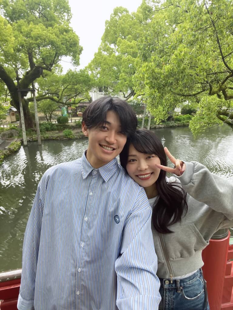 彼はストライプ柄のシャツを着用し、ナチュラルな雰囲気。彼女はカジュアルなパーカーに身を包み、顔の横でピースサインを作っています。肩を軽く寄せ合いながら撮影されたその姿からは、付き合い始めた頃のフレッシュさと、少し照れくささの残るような空気感が伝わってきます。