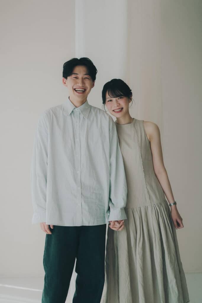 彼は淡い色のシャツにゆったりとしたパンツ、彼女は落ち着いた色味のワンピースを着用。全体的に柔らかく統一されたコーディネートが印象的で、洗練された雰囲気が漂います。