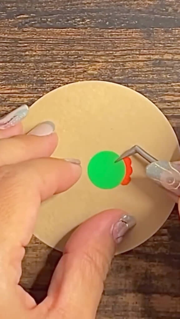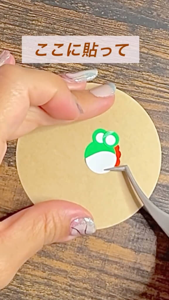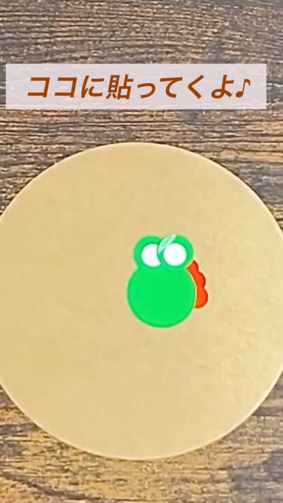 続いて、中くらいの黄緑丸シールに小さい白丸シールを重ね、同じものを2つ用意。これを先ほど作ったパーツの上部に貼っていきます。赤いトサカに緑のお顔……そろそろ何のキャラクターか、気付いた人も多いのではないでしょうか?