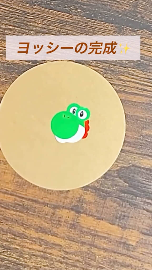 次に、大きめの白丸シールをカットし、黄緑丸シールの下部に沿わせて貼付。中くらいの白丸シールを重ねたら、その上から大きめの黄緑丸シールを貼り付けます。最後に黒ペンで目と鼻を描き込めば、任天堂の人気キャラクター「ヨッシー」が完成です!