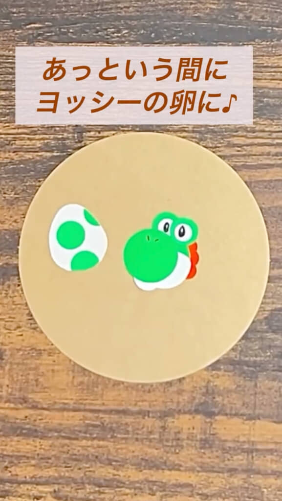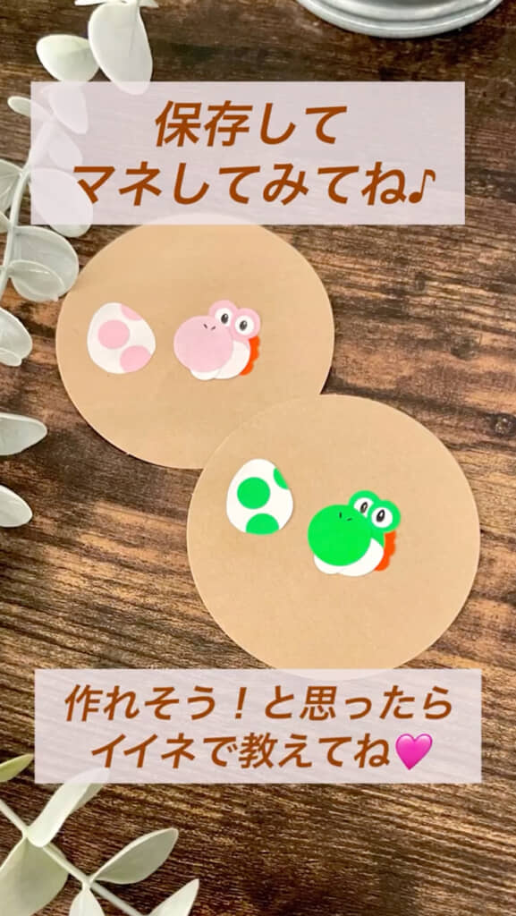 さらに、大きめの白丸シールに小さな黄緑丸シールを3つ貼り、卵型にカットすることでヨッシーの卵を作ることができます。丸シールはさまざまな色が展開されているので、好みに合わせて色を変えるのもおすすめ。パステルカラーを使えば、やわらかい印象のアレンジも楽しめますよ。