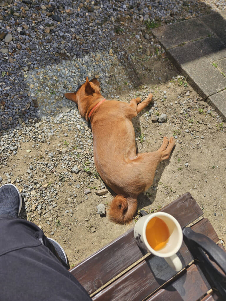 こはるさんと瓜二つのわんちゃんの姿が! まるで生き別れの兄弟みたいにそっくり……かと思いきや、よく見ると同じ首輪をつけているような……。