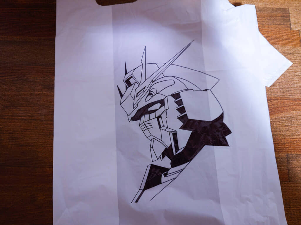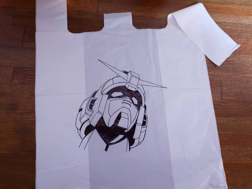 袋に描き込まれたのは、「機動戦士ガンダムSEED」の主人公機「ストライクガンダム」の横顔。ずれないようにビニール袋をマスキングテープで机に貼り付け、鉛筆で下描きをしてサインペンでペン入れを……と、丁寧に描き込んだそうです。