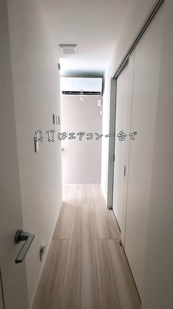 夏の暑さ対策には、エアコンの設置場所にこだわりました。階段上に設置することで冷気が吹き抜けを通じて1階から2階まで部屋全体に自然と行き渡る設計に。暑い季節でも、家の隅々までしっかりと冷やせるようになっています。