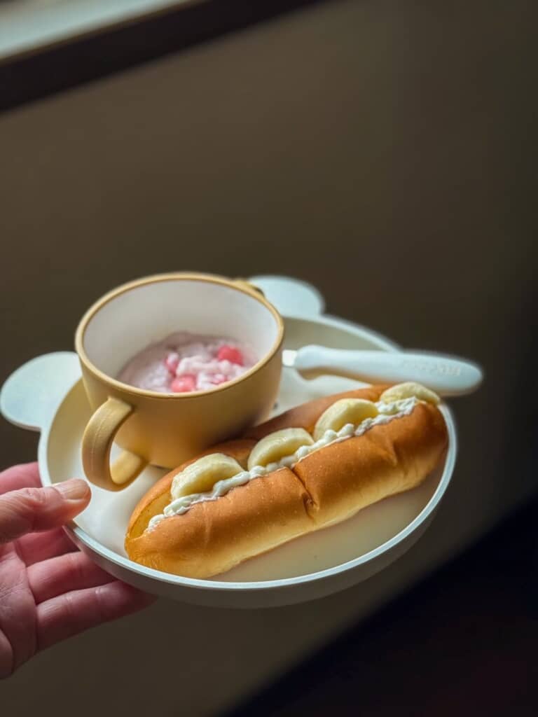 2枚目の写真は、バナナとクリームを挟んだコッペパンが主役のプレートです。奥にはやさしいピンク色のフルーチェが載っており、息子さんの喜ぶ顔が目に浮かぶようです。
