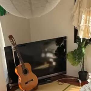 さらに立てかけられたギターや、モダンなちょうちん型のペンダントライトなど、和のテイストにさりげないアクセントをプラス。建物は木造ではなく軽量鉄骨造のため、隣室の音も気になりにくいとのこと。西向きの部屋ということもあり、冬は暖かく、夕焼けを楽しめるのも魅力のひとつです。