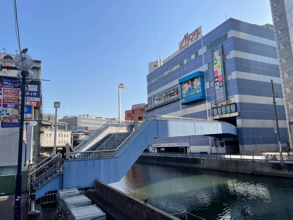 ビルのすぐそばを流れる帷子川(かたびらがわ)の対岸から、直接ビル内の映画館に出入りできる橋がかかっているのですが、よくよく見ると……なんと、橋を支えるための柱が見当たりません。つまり橋は、川の両岸の接点部分だけで自重を支えていたのです。