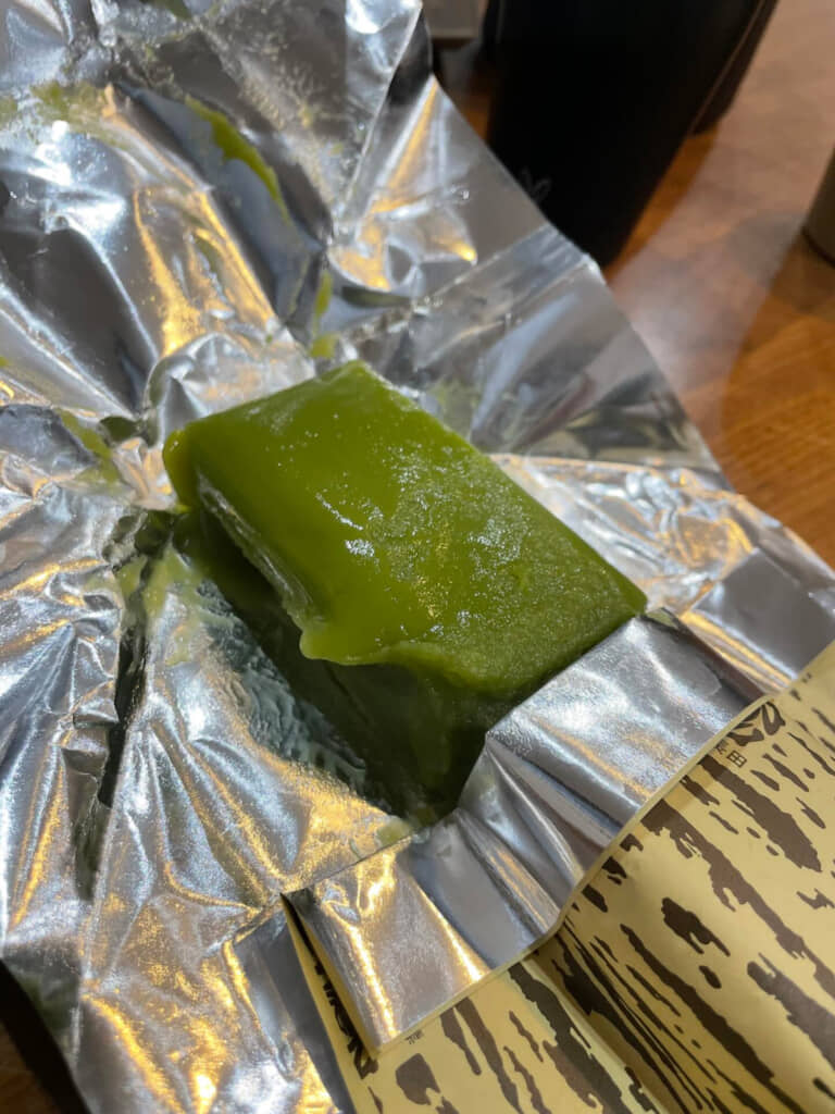 今回、だんな君さんは抹茶味に初挑戦。写真には深緑色のういろが写っており、蒸し菓子特有のもちもちした食感が楽しめそうな一品です。だんな君さんは、「うんまかったです」と大満足の様子でした。