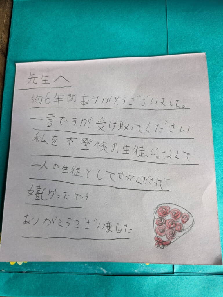 そして「私を不登校の生徒じゃなくて」「一人の生徒としてせっしてくださって嬉しかったです」と続けます。最後は「ありがとうございました」という感謝の言葉と花束のイラストがありました。思いのこもったこの言葉からは、娘さんにしっかりと向き合った先生の姿が手紙を通して見えるようです。