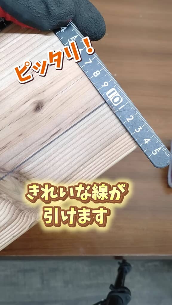 正しい使い方として重要なのは、差し金の「長手(長い辺)」を木材の縁にしっかりと当てることです。画像では、長手をピタッと木材の端に沿わせ、手でしっかりと安定させている様子が確認できます。そして、わずかにたわむ程度に軽く押さえること。