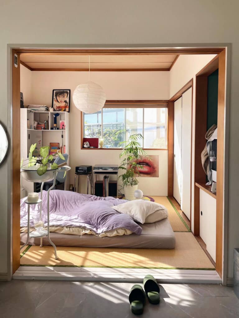 畳が敷かれた和室は寝室兼仕事部屋として使っているようで、ラベンダー色がすてきな布団やデスクが。柔らかい日差しが窓際の観葉植物に降り注ぎ、温かみのある雰囲気を演出しています。ポスターやイラストも飾られ、まるでドラマのセットのようにおしゃれです。