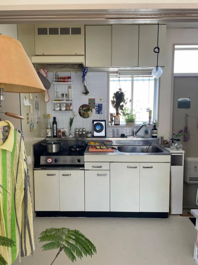 キッチンは調味料や調理器具がきちんと整頓され、自炊がはかどりそうな空間に。生活感がありながらも、淡い水色のタイル壁や、ところどころに飾られた植物が明るさをプラスしてくれています。